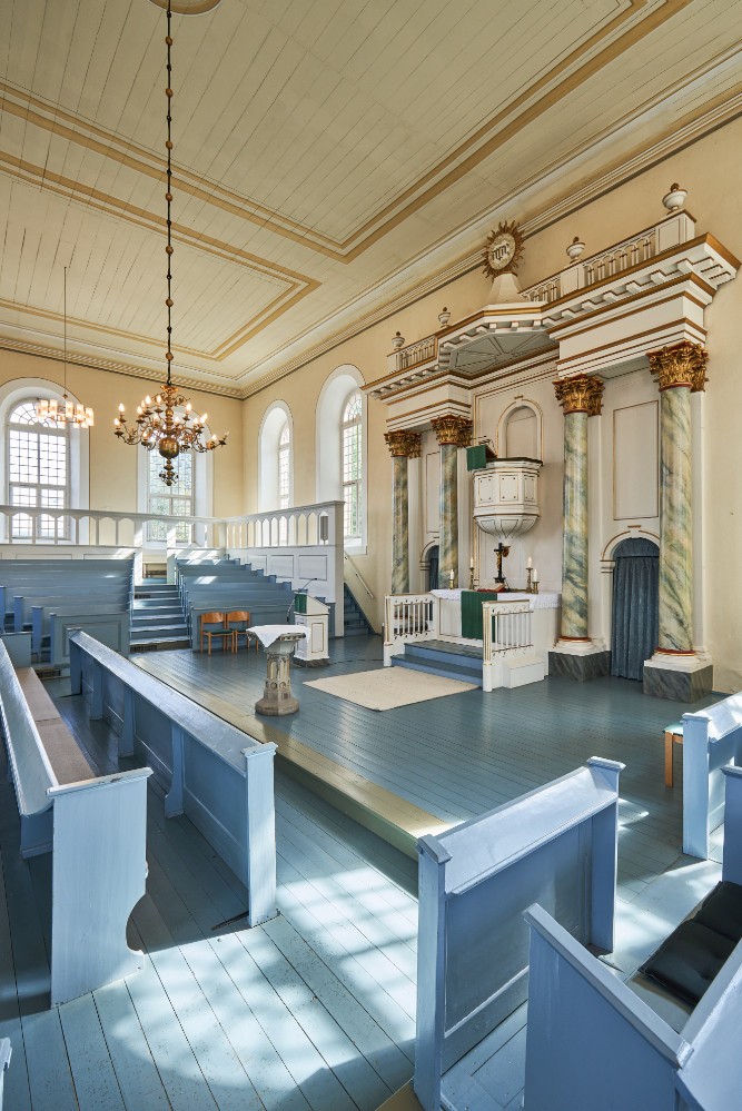 Der Innenraum der am Ende des 18. Jahrhunderts erbauten neoklassizistischen St. Petri-Kirche in Landolfshausen erinnert beinahe an ein kleines Theater und lädt in diesem Jahr zum räumlich-akustischen Experimentieren ein.