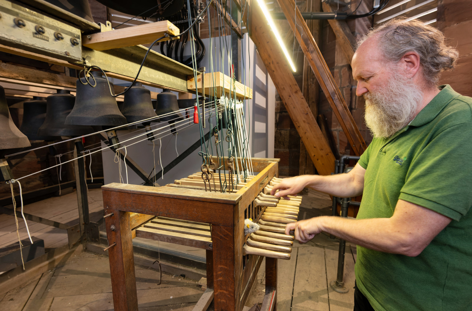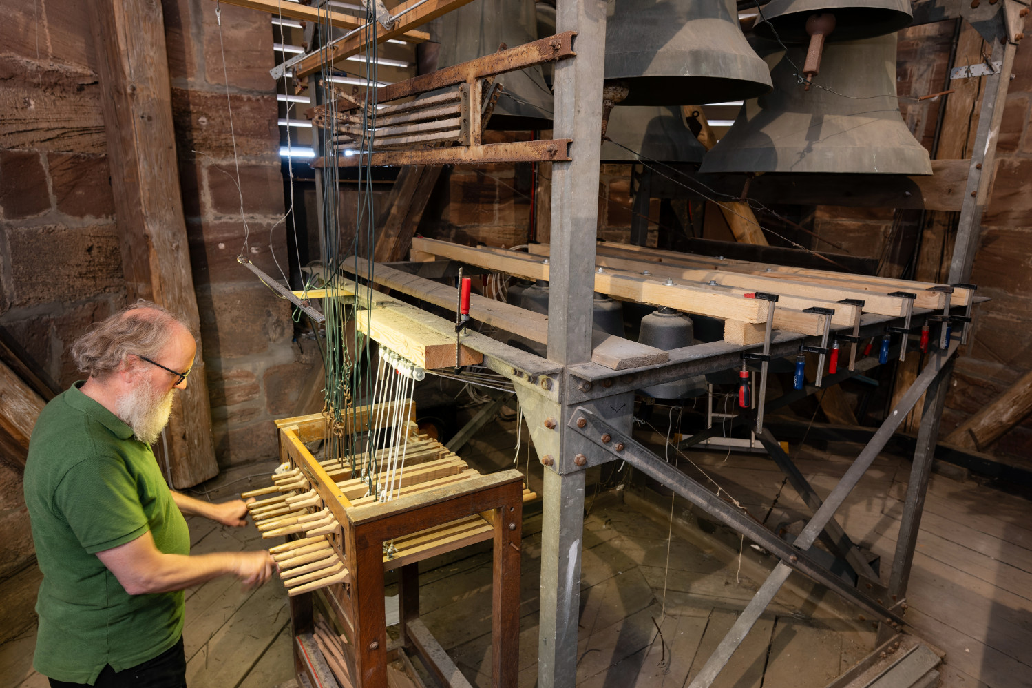 220 steps to heaven: high up in the church tower of St. Jacobi, music is made at altitude. Martin Begemann plays the one-and-a-half tonne instrument here – the carillon of St. Jacobi. Like an organ, the carillon is played with hands and feet. At a so-called baton keyboard with wooden keys and foot pedals, the tower bells are struck by means of a mechanical system. The Göttingen physicist Ernst Puschmann, who died in 2024 and was also known as the “bell-ringer of St. Jacobi”, expanded the tower chimes into a concert carillon with 23 bells.